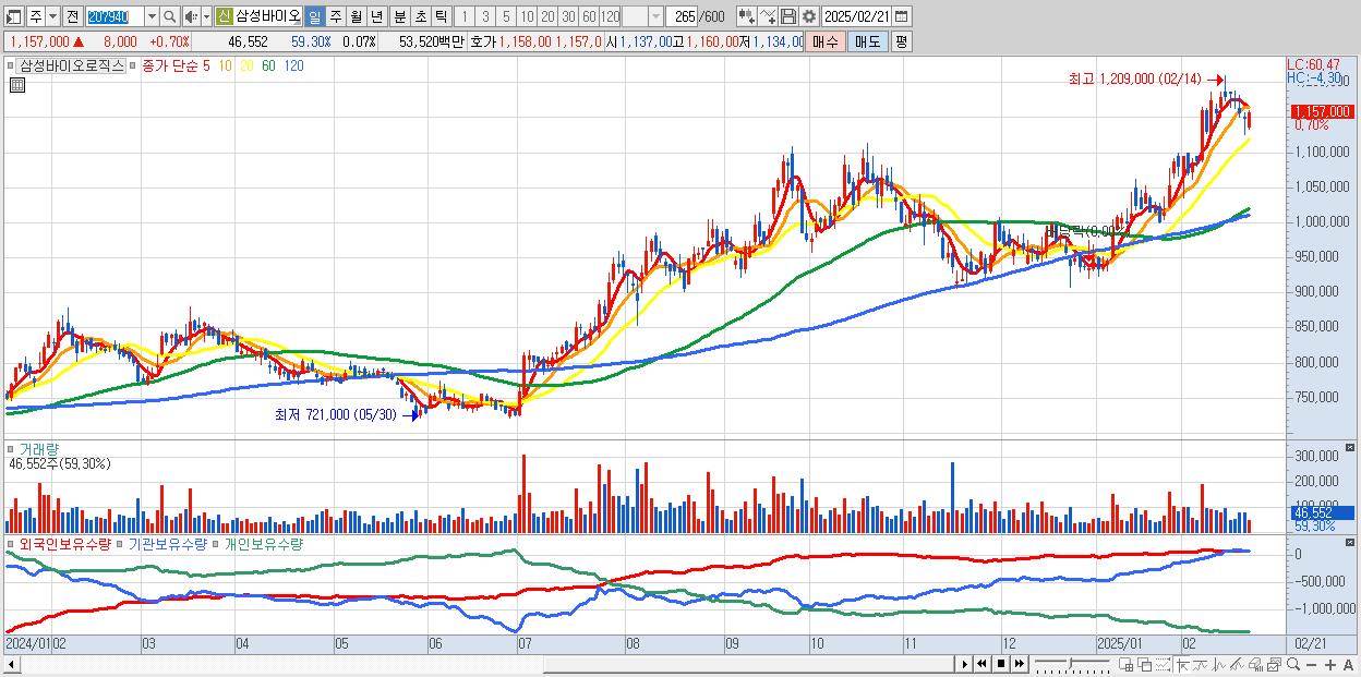 - 삼성바이오로직스 (1,157,000원 ▲ 0.7% , 시총: 823,483억, 외국인 순매수 거래금:80억)
