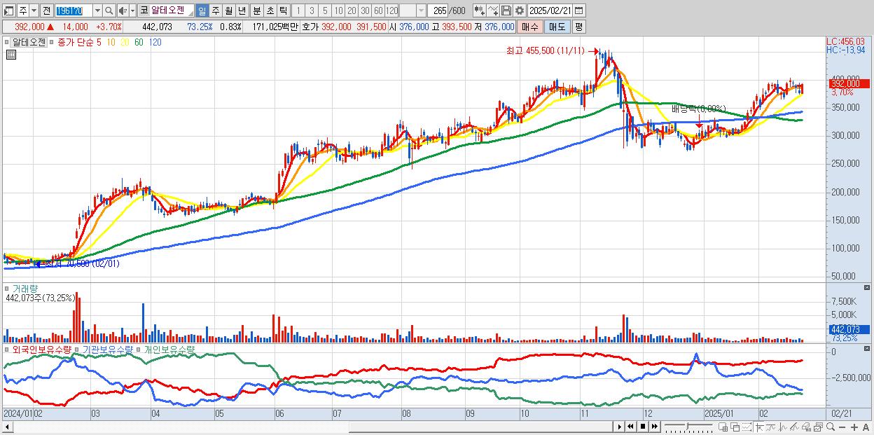 - 알테오젠 (392,000원 ▲ 3.7% , 시총: 209,010억, 외국인 순매수 거래금:299억)