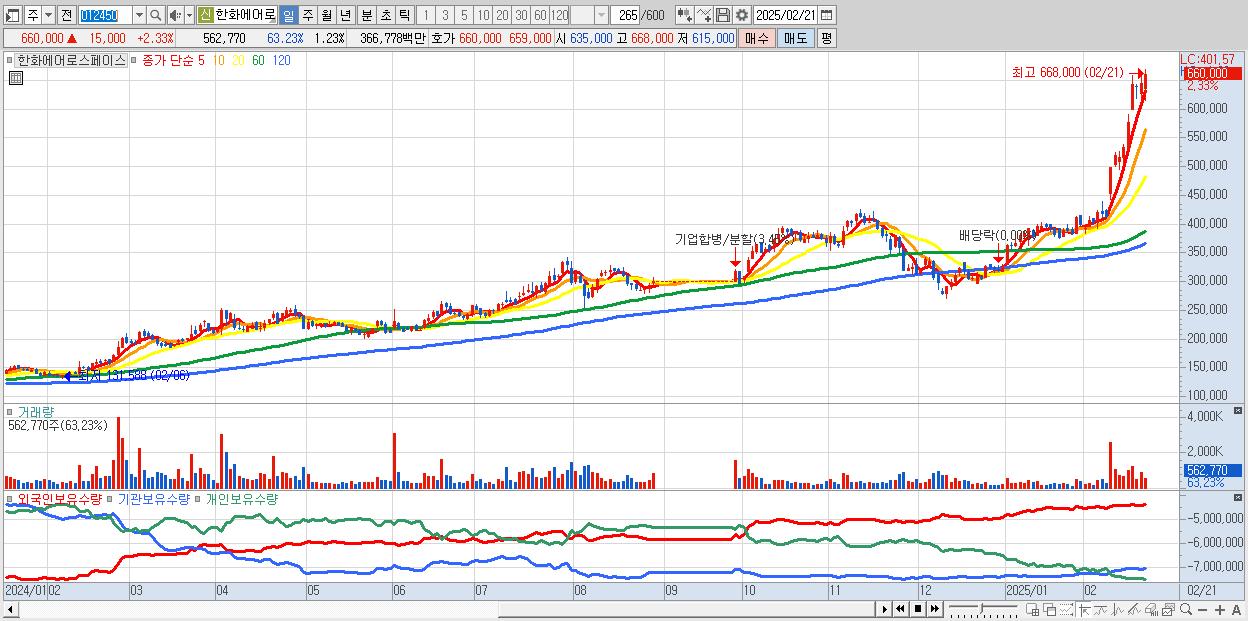 - 한화에어로스페이스 (660,000원 ▲ 2.33% , 시총: 300,836억, 외국인 순매수 거래금:370억)