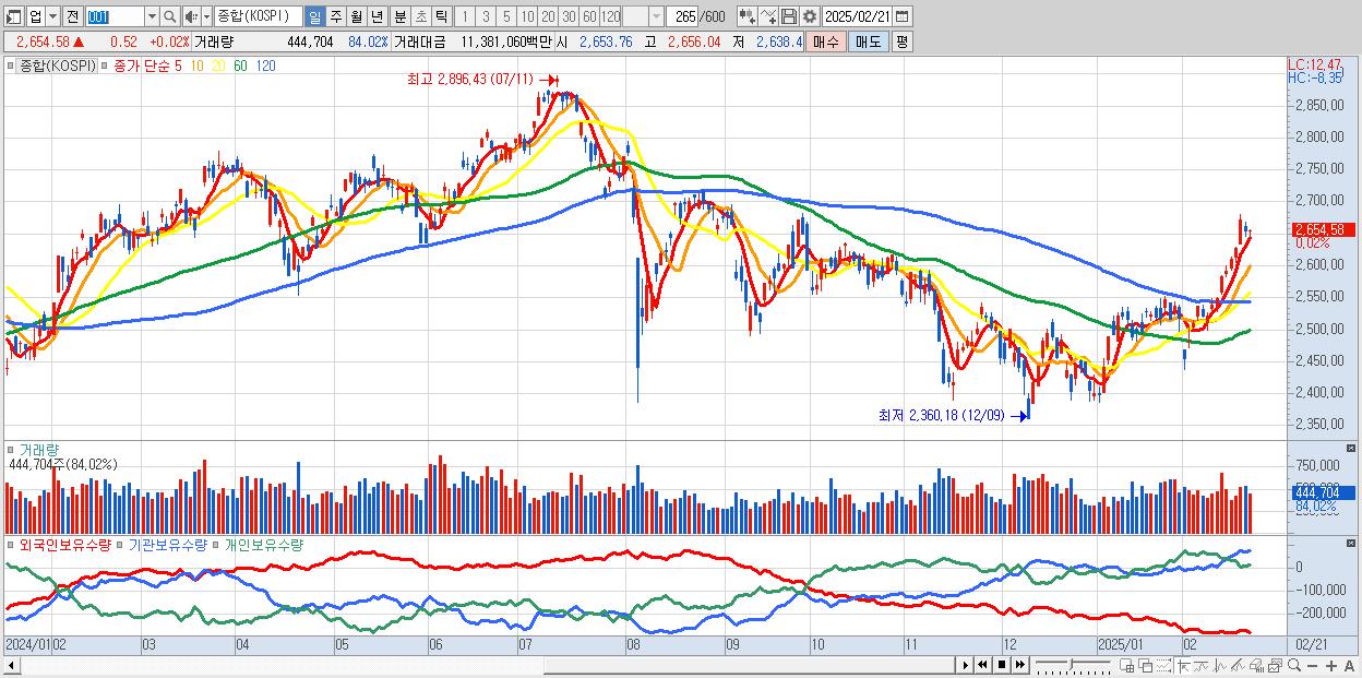 | 02/21 | 2,654.58 | ▲0.02% | 28억 | -2,181억 | 1,181억 | 972억 |