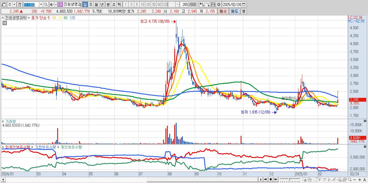 - 진원생명과학 (2,245원 ▲ 9.78% , 시총: 1,797억, 거래량: 4,603,533, 거래대금:108억)