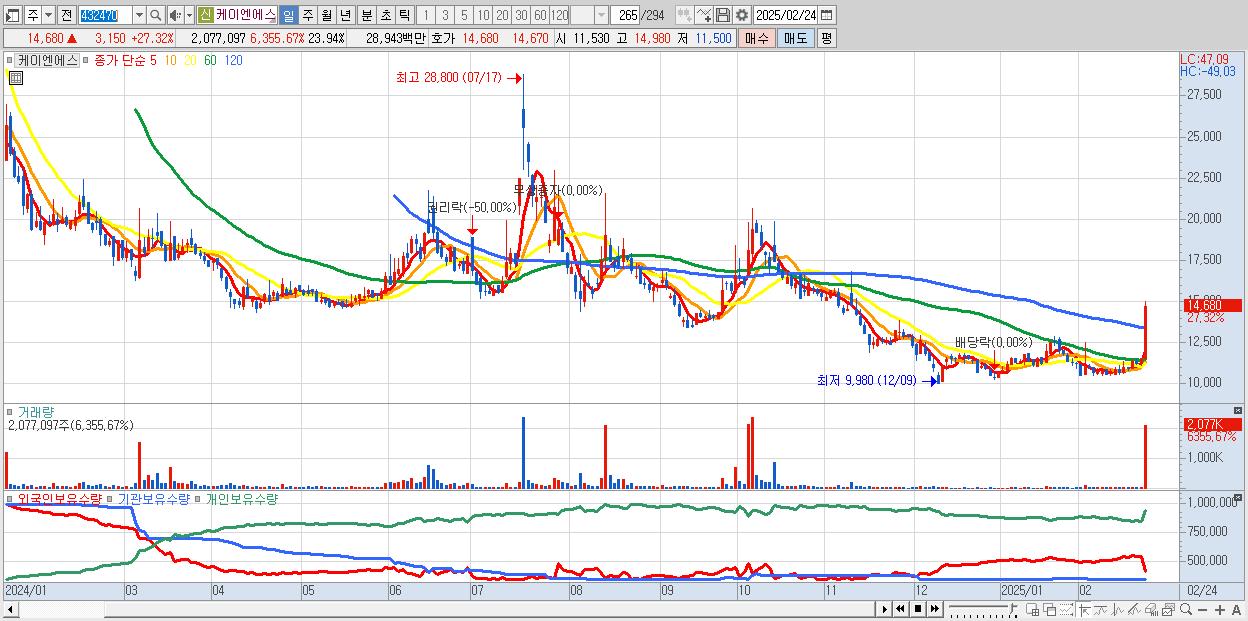 - 케이엔에스 (14,680원 ▲ 27.32% , 시총: 1,273억, 거래량: 2,077,097, 거래대금:289억)