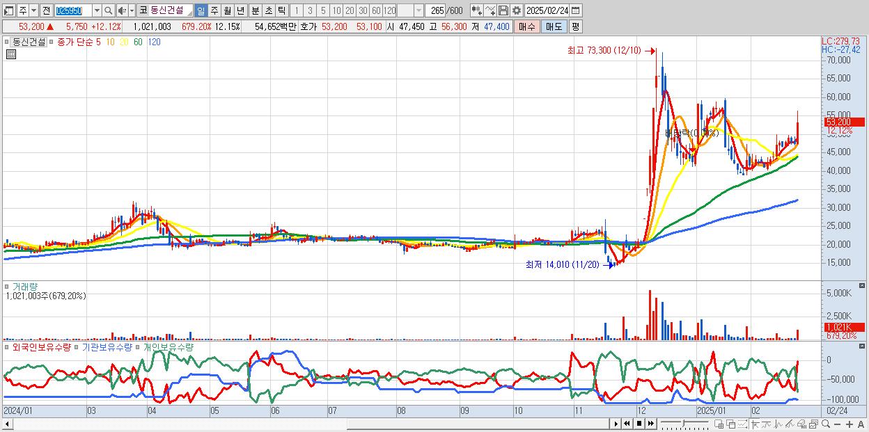 - 동신건설 (53,200원 ▲ 12.12% , 시총: 4,469억, 거래량: 1,021,003, 거래대금:547억)