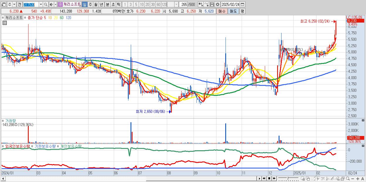 - 캐리소프트 (6,230원 ▲ 9.49% , 시총: 625억, 거래량: 143,288, 거래대금:9억)