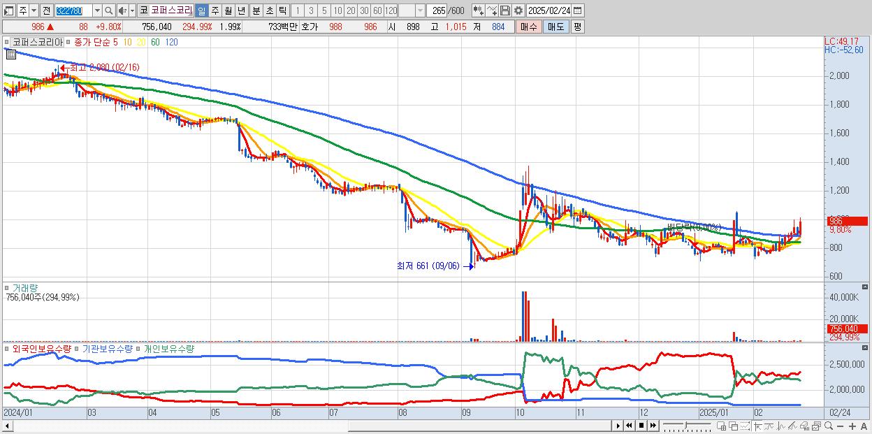 - 코퍼스코리아 (986원 ▲ 9.8% , 시총: 374억, 거래량: 756,040, 거래대금:7억)
