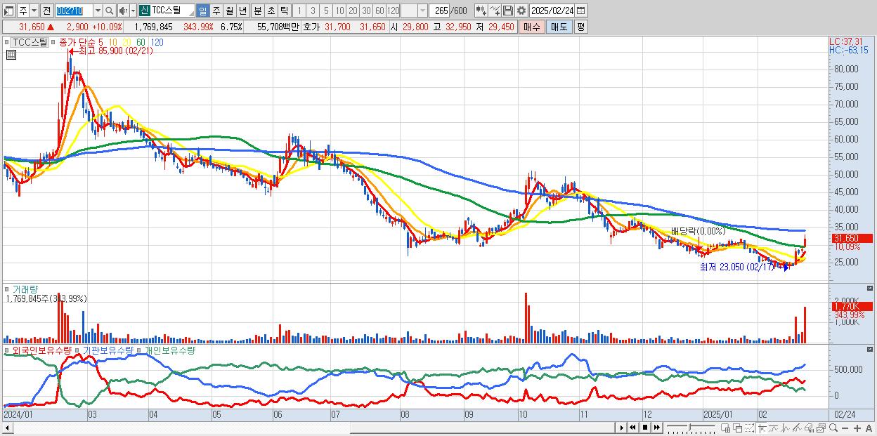 - TCC스틸 (31,650원 ▲ 10.09% , 시총: 8,297억, 거래량: 1,769,845, 거래대금:557억)