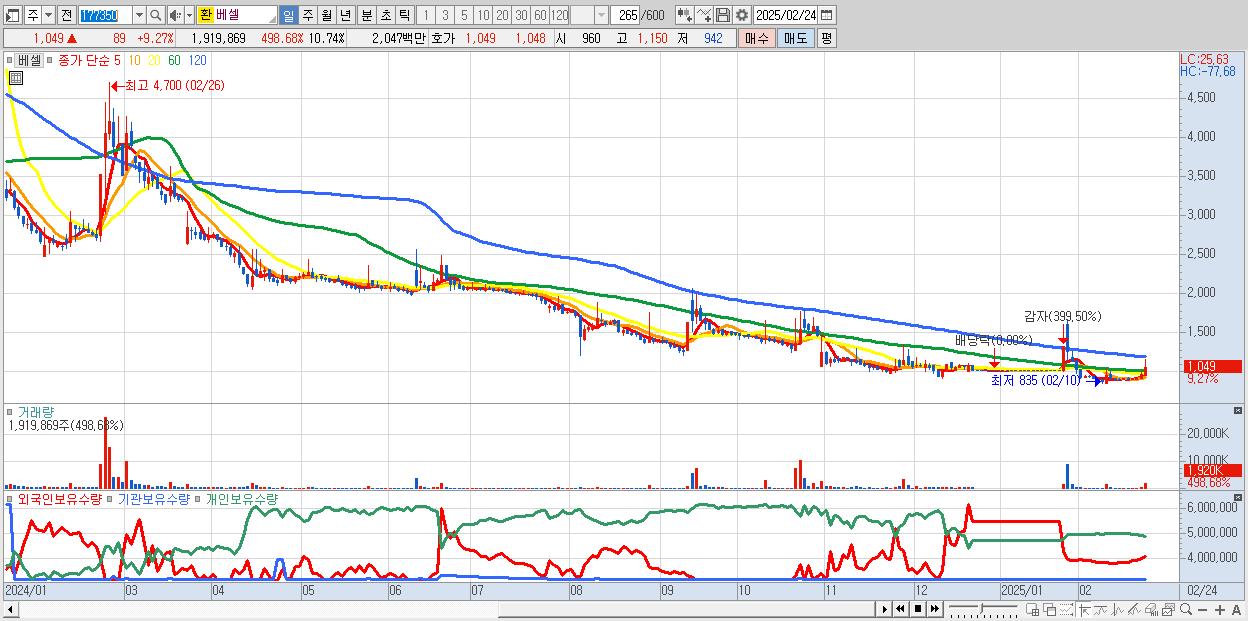 - 베셀 (1,049원 ▲ 9.27% , 시총: 188억, 거래량: 1,919,869, 거래대금:20억)