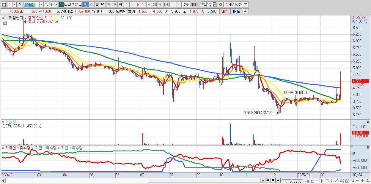 - 나라엠앤디 (4,505원 ▲ 14.63% , 시총: 640억, 거래량: 6,679,152, 거래대금:302억)