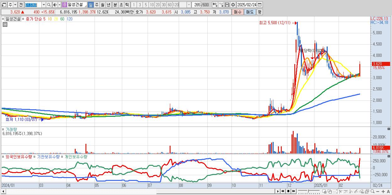 - 일성건설 (3,620원 ▲ 15.65% , 시총: 1,956억, 거래량: 6,816,195, 거래대금:244억)