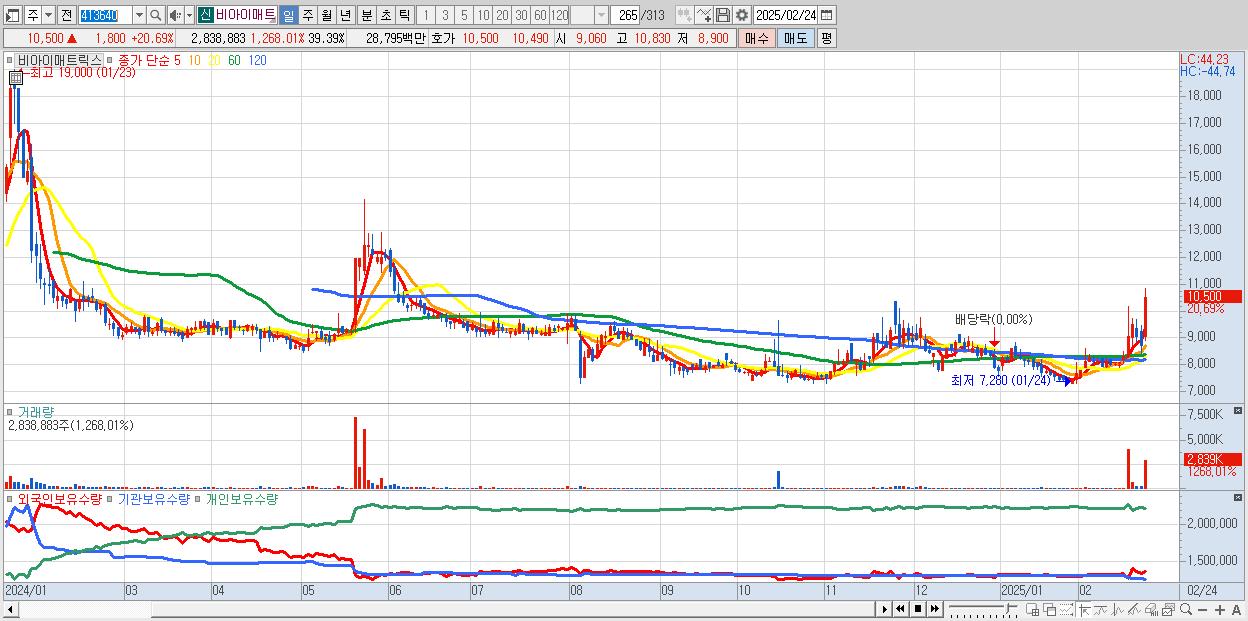 - 비아이매트릭스 (10,500원 ▲ 20.69% , 시총: 757억, 거래량: 2,838,883, 거래대금:288억)