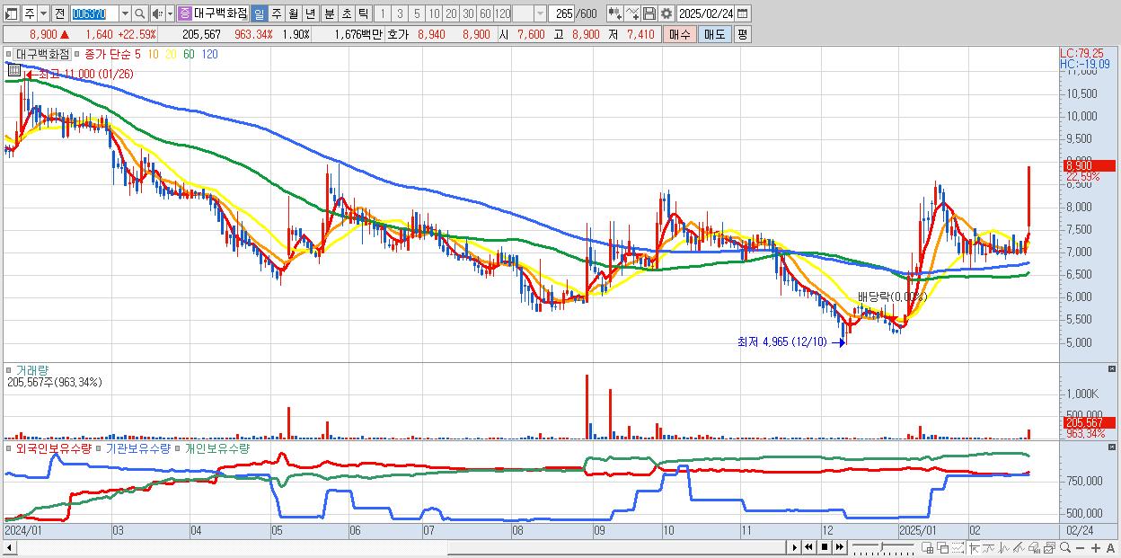 - 대구백화점 (8,900원 ▲ 22.59% , 시총: 963억, 거래량: 205,567, 거래대금:17억)