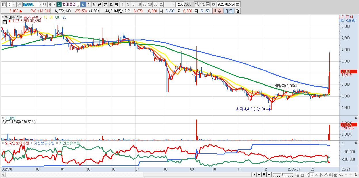 - 현대공업 (6,060원 ▲ 13.91% , 시총: 930억, 거래량: 6,872,133, 거래대금:435억)