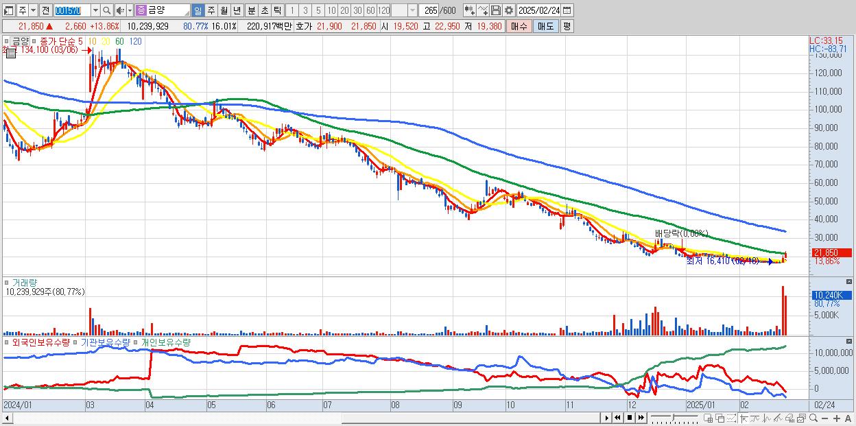 - 금양 (21,850원 ▲ 13.86% , 시총: 13,977억, 거래량: 10,239,929, 거래대금:2,209억)