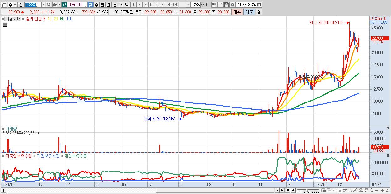 - 대동기어 (22,900원 ▲ 11.17% , 시총: 2,058억, 거래량: 3,857,231, 거래대금:862억)