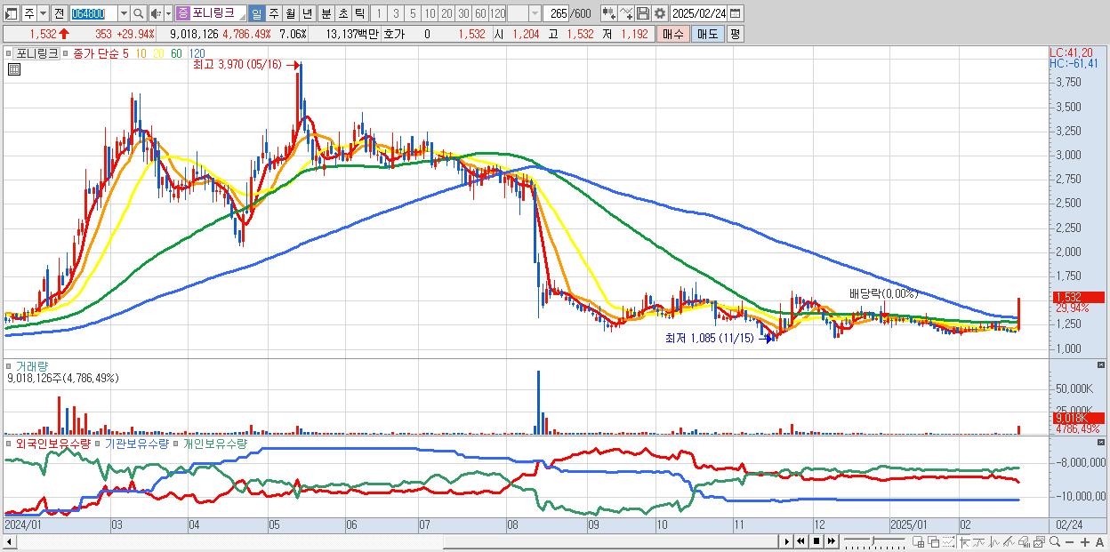 - 포니링크 (1,532원 ▲ 29.94% , 시총: 1,958억, 거래량: 9,018,126, 거래대금:131억)