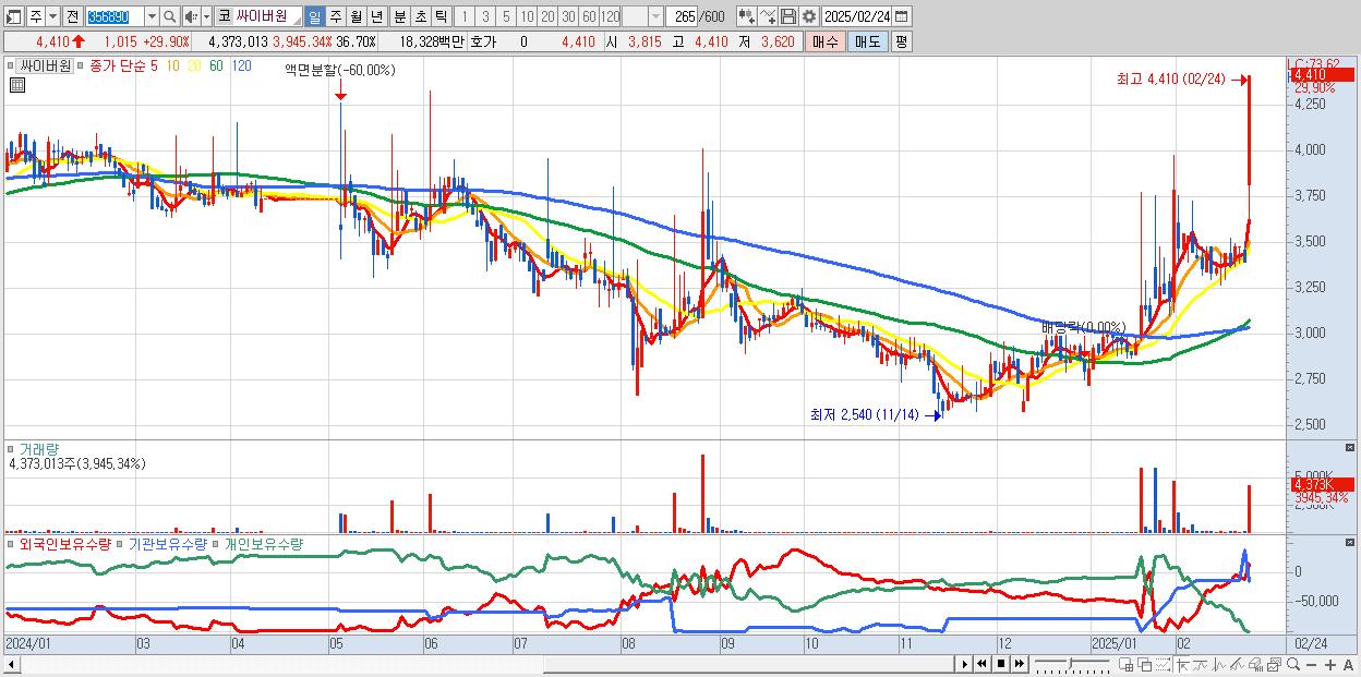 - 싸이버원 (4,410원 ▲ 29.9% , 시총: 526억, 거래량: 4,373,013, 거래대금:183억)