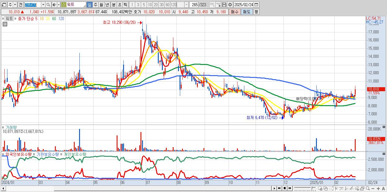 - 워트 (10,010원 ▲ 11.59% , 시총: 1,614억, 거래량: 10,871,897, 거래대금:1,084억)