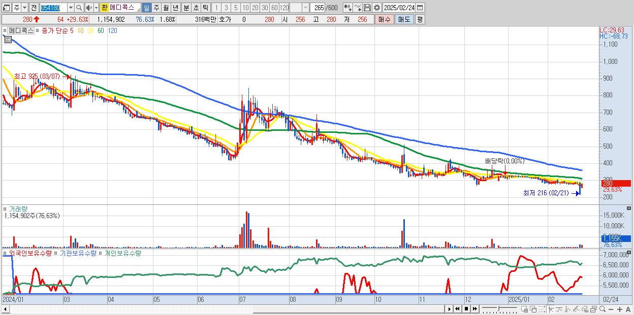 - 메디콕스 (280원 ▲ 29.63% , 시총: 193억, 거래량: 1,154,902, 거래대금:3억)