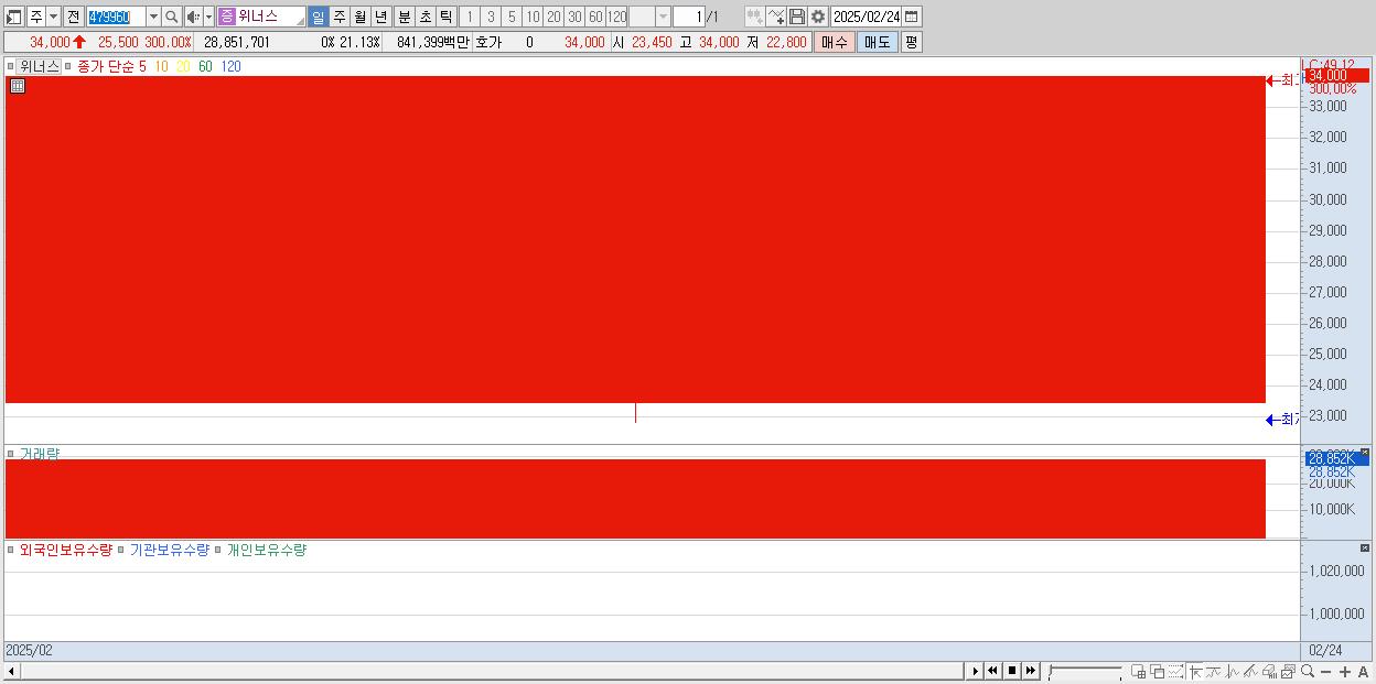 - 위너스 (34,000원 ▲ 300% , 시총: 2,329억, 거래량: 28,851,701, 거래대금:8,414억)