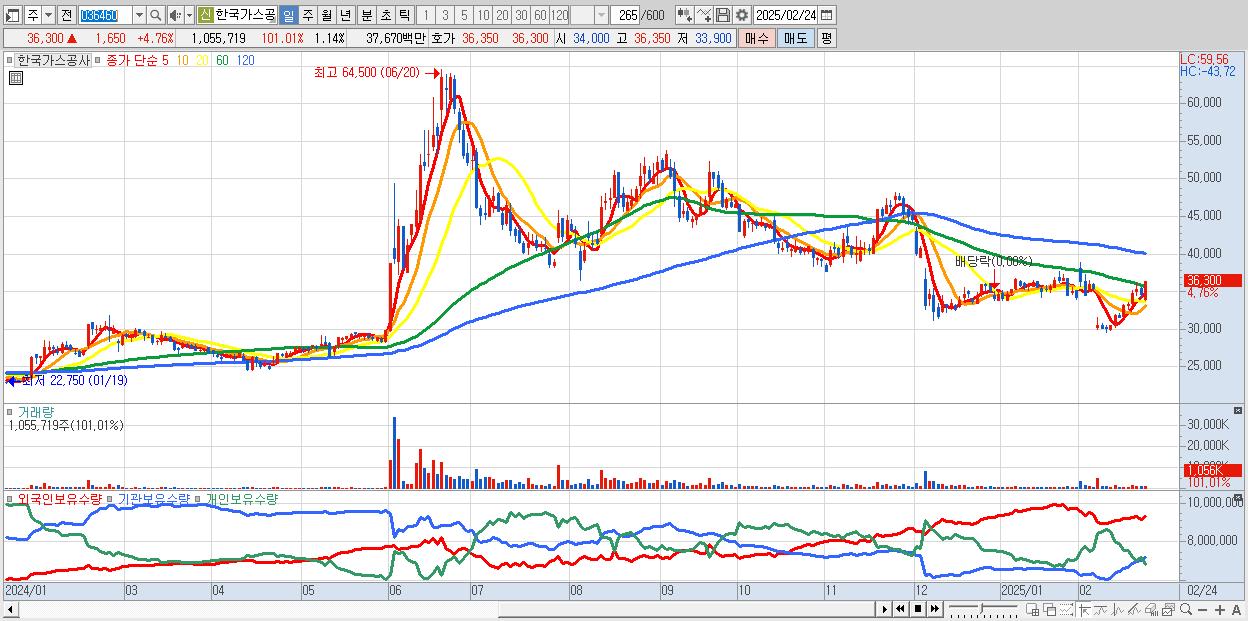 - 한국가스공사 (36,300원 ▲ 4.76% , 시총: 33,510억, 외국인 순매수 거래금:80억)