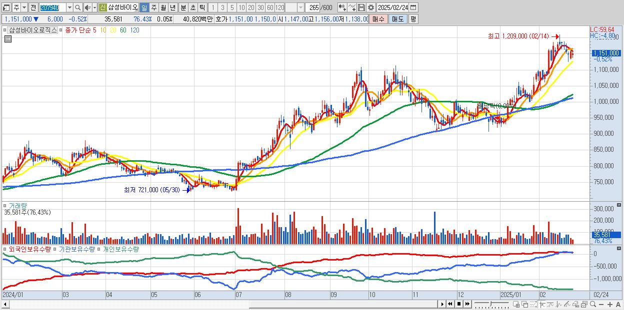 - 삼성바이오로직스 (1,151,000원 ▼ -0.52% , 시총: 819,213억, 외국인 순매수 거래금:80억)