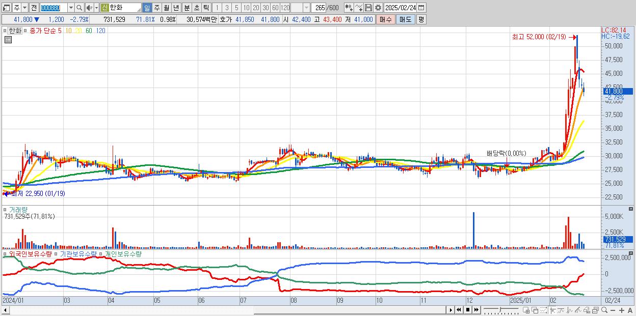 - 한화 (41,800원 ▼ -2.79% , 시총: 31,333억, 외국인 순매수 거래금:67억)