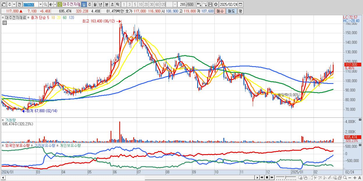 - 대주전자재료 (117,000원 ▲ 6.46% , 시총: 18,112억, 외국인 순매수 거래금:40억)