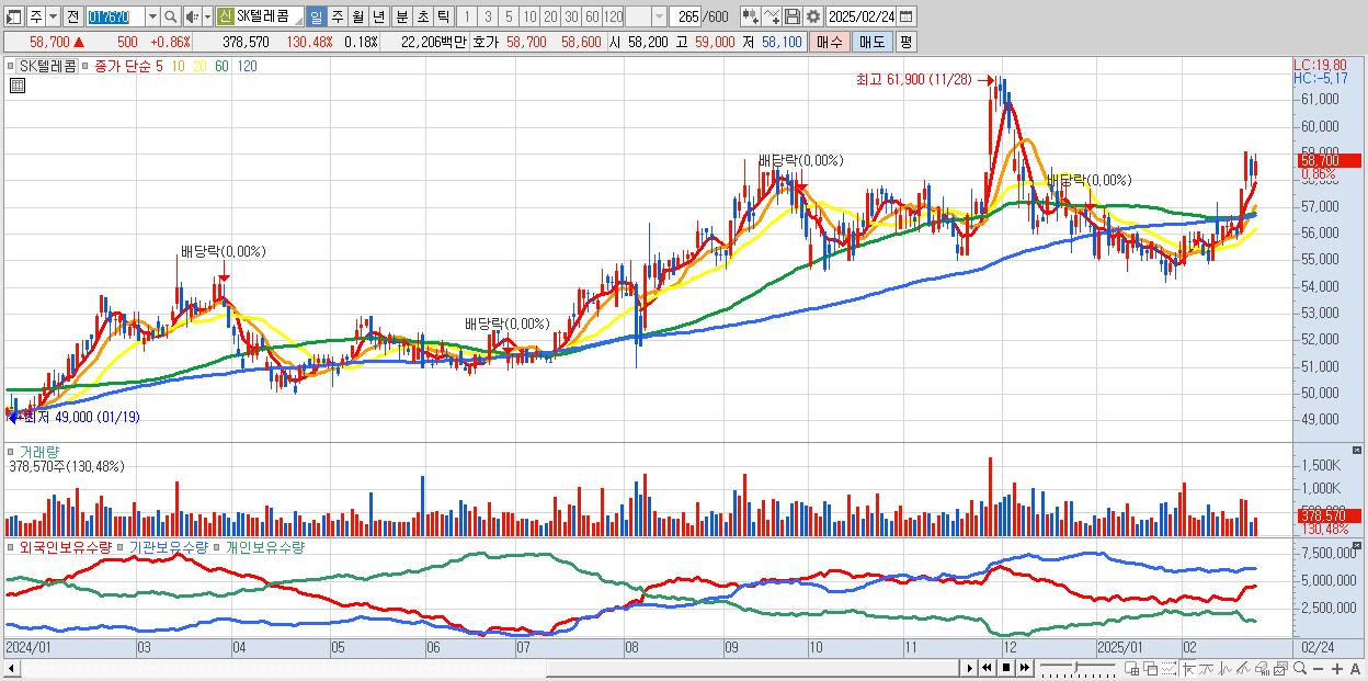 - SK텔레콤 (58,700원 ▲ 0.86% , 시총: 126,082억, 외국인 순매수 거래금:34억)