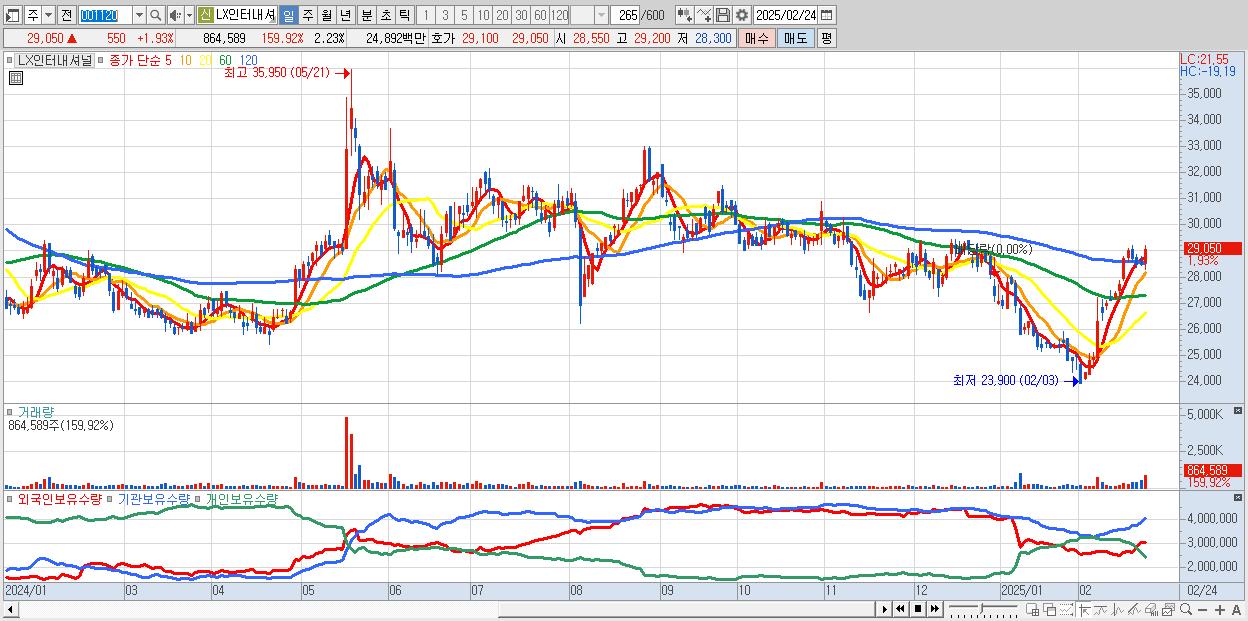 - LX인터내셔널 (29,050원 ▲ 1.93% , 시총: 11,260억, 외국인 순매수 거래금:33억)