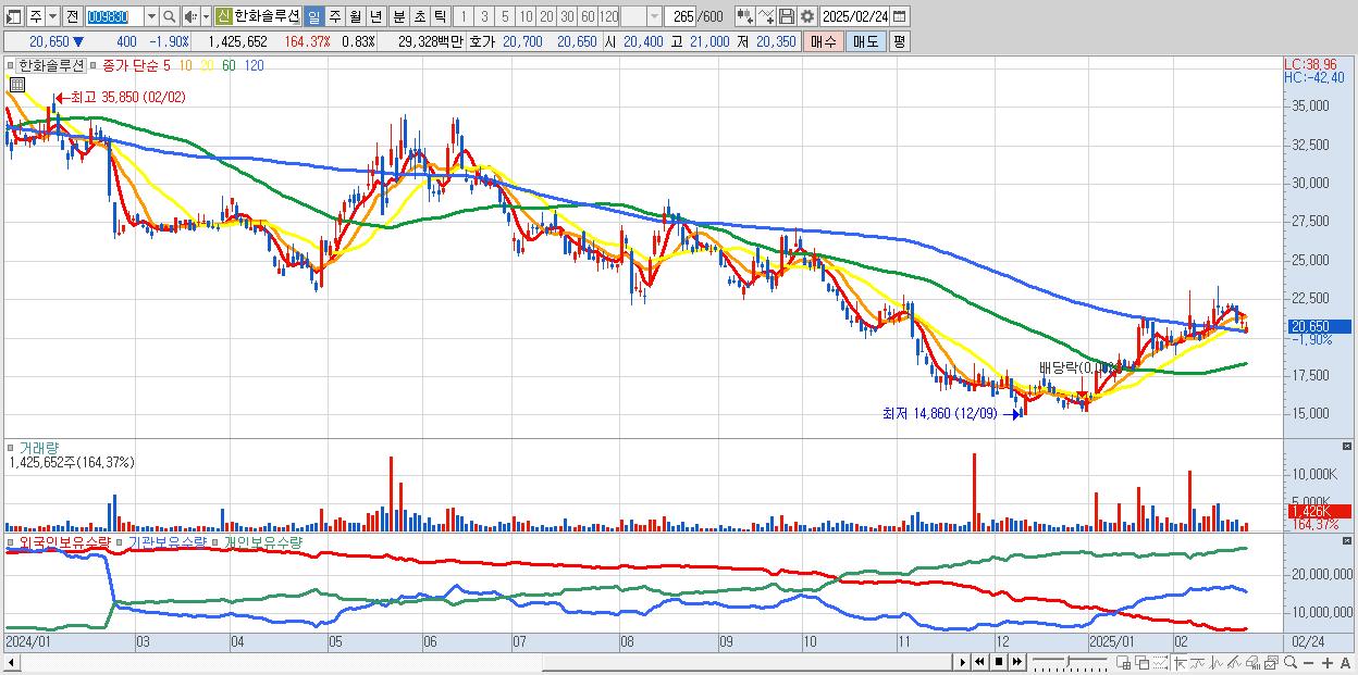 - 한화솔루션 (20,650원 ▼ -1.9% , 시총: 35,496억, 외국인 순매수 거래금:36억)