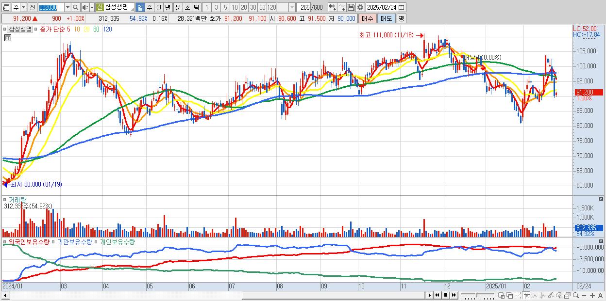 - 삼성생명 (91,200원 ▲ 1% , 시총: 182,400억, 외국인 순매수 거래금:77억)