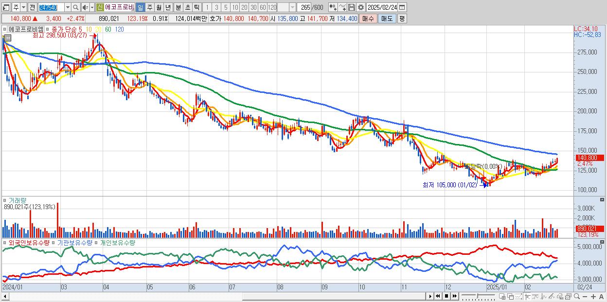 - 에코프로비엠 (140,800원 ▲ 2.47% , 시총: 137,704억, 외국인 순매수 거래금:34억)