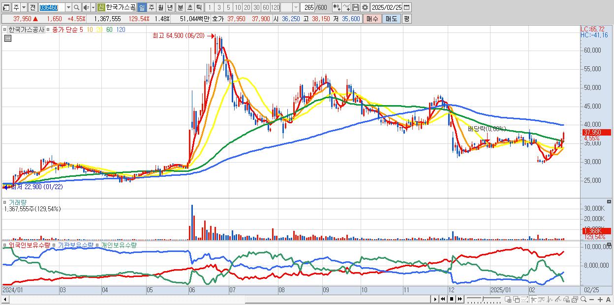 - 한국가스공사 (37,950원 ▲ 4.55% , 시총: 35,033억, 외국인 순매수 거래금:90억)