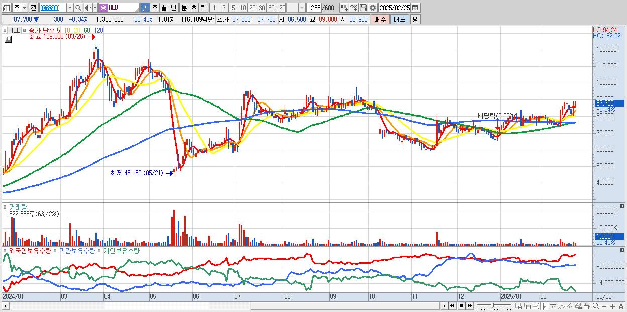 - HLB (87,700원 ▼ -0.34% , 시총: 115,227억, 외국인 순매수 거래금:172억)