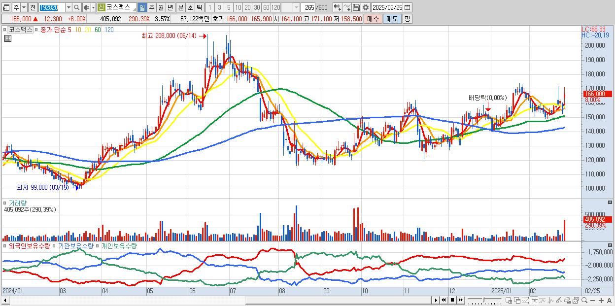 - 코스맥스 (166,000원 ▲ 8% , 시총: 18,840억, 외국인 순매수 거래금:75억)