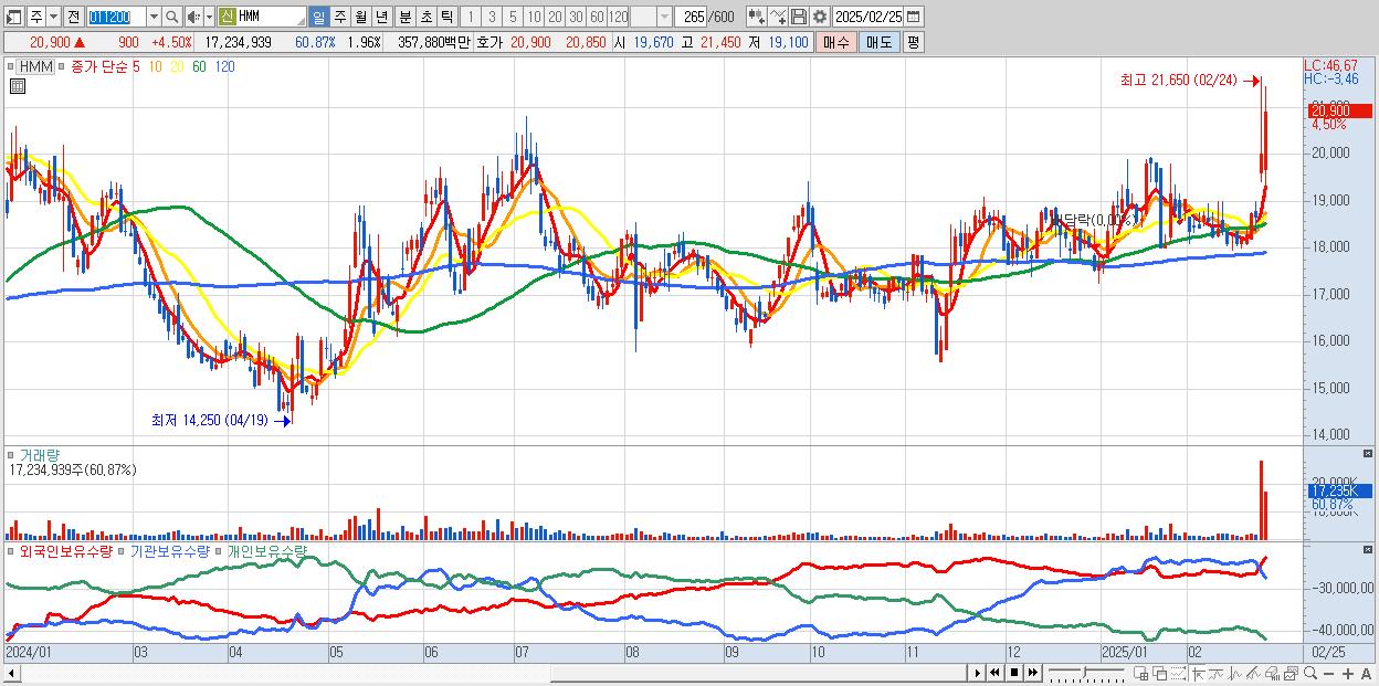 - HMM (20,900원 ▲ 4.5% , 시총: 184,137억, 외국인 순매수 거래금:372억)