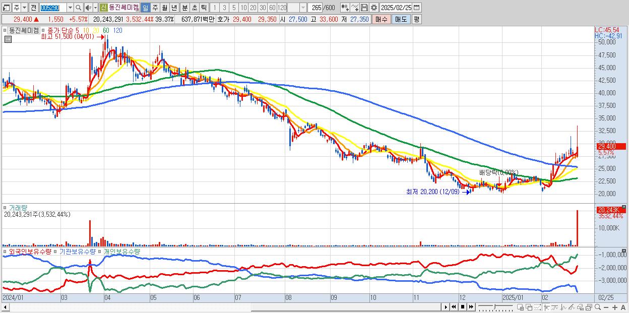 - 동진쎄미켐 (29,400원 ▲ 5.57% , 시총: 15,116억, 외국인 순매수 거래금:94억)