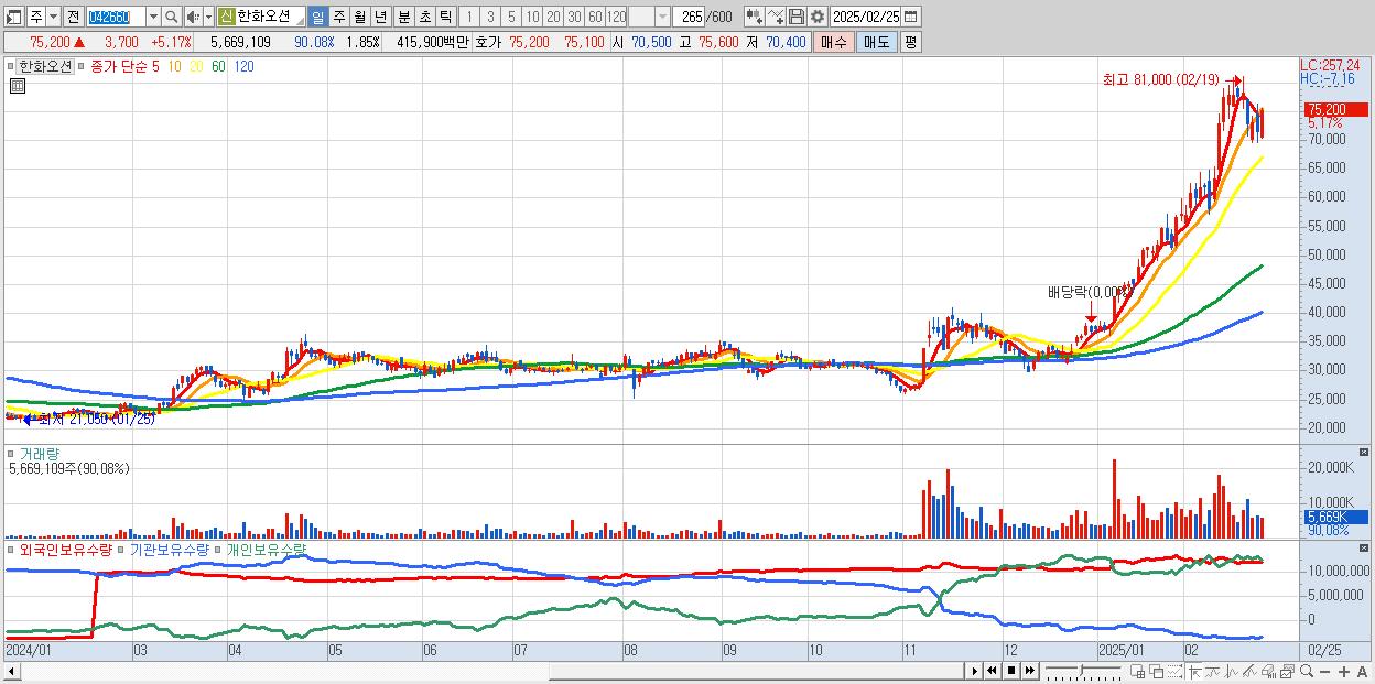- 한화오션 (75,200원 ▲ 5.17% , 시총: 230,423억, 외국인 순매수 거래금:272억)