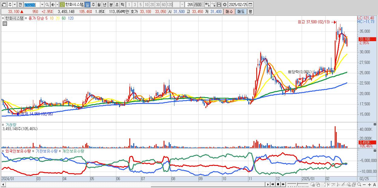 - 한화시스템 (33,100원 ▲ 2.95% , 시총: 62,532억, 외국인 순매수 거래금:80억)