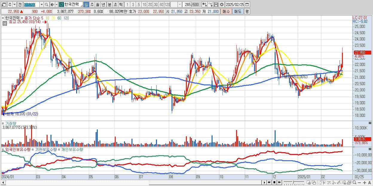 - 한국전력 (22,950원 ▲ 4.08% , 시총: 147,331억, 외국인 순매수 거래금:97억)