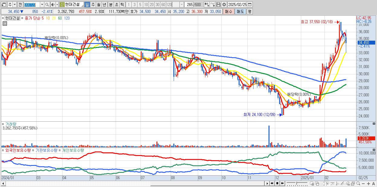 - 현대건설 (34,450원 ▼ -2.41% , 시총: 38,362억, 외국인 순매수 거래금:101억)