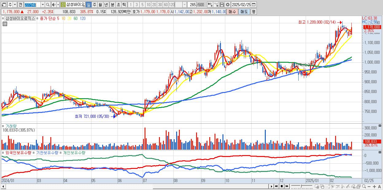 - 삼성바이오로직스 (1,178,000원 ▲ 2.35% , 시총: 838,430억, 외국인 순매수 거래금:327억)