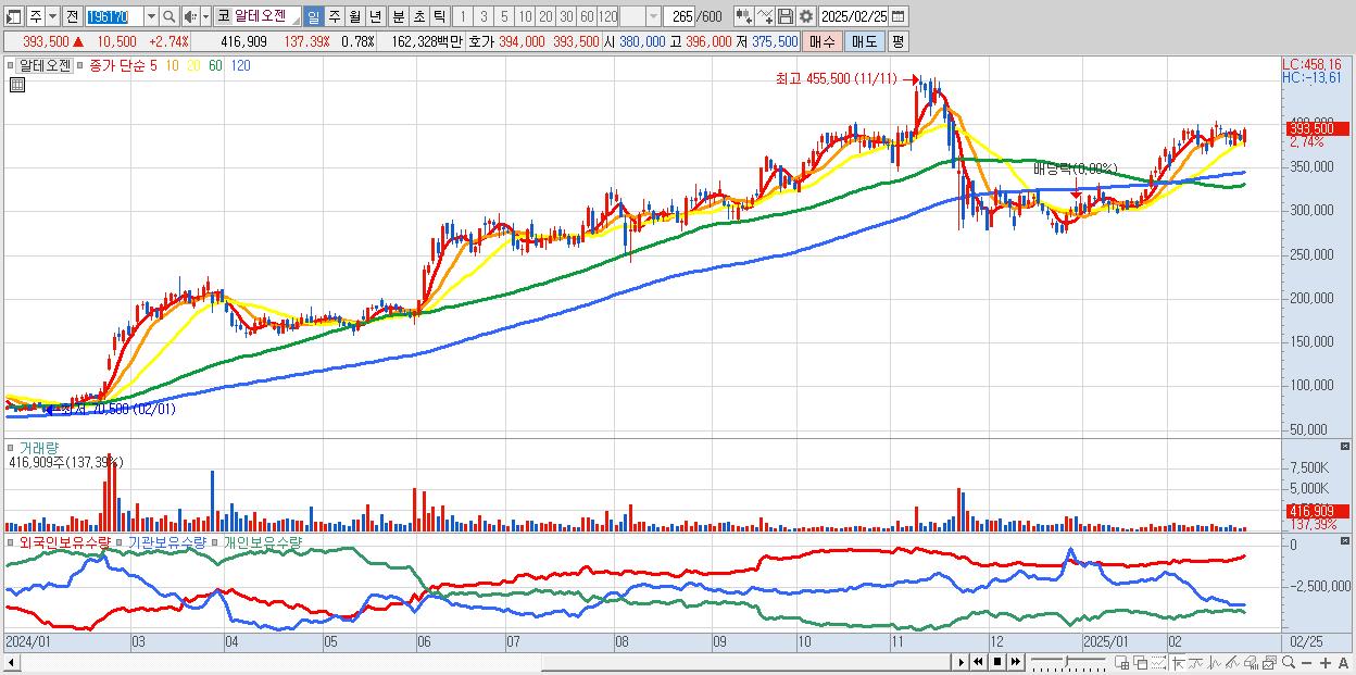 2.알테오젠 393,500원 ▲ 2.74% (KOSDAQ, 196170)