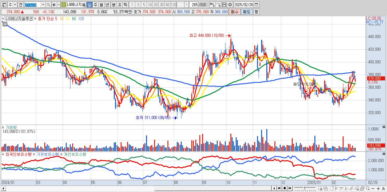 - LG에너지솔루션 (374,000원 ▲ 0.13% , 시총: 875,160억, 외국인 순매수 거래금:50억)