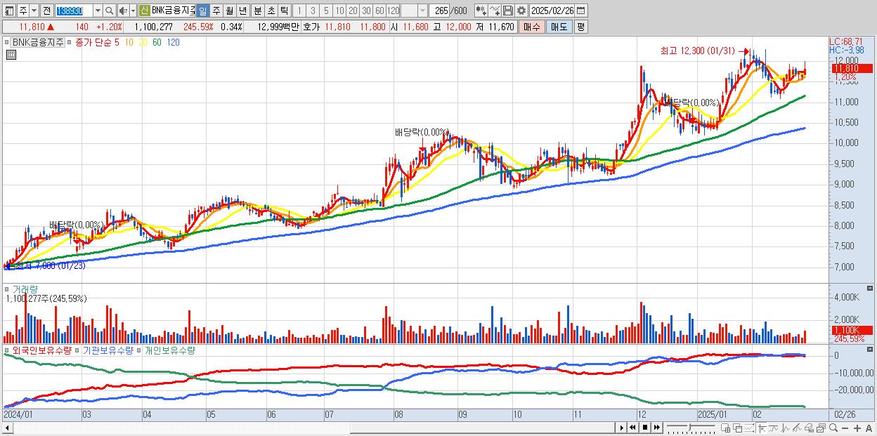 - BNK금융지주 (11,810원 ▲ 1.2% , 시총: 37,844억, 외국인 순매수 거래금:38억)