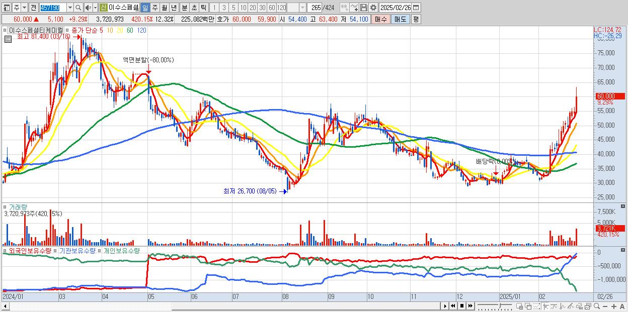 - 이수스페셜티케미컬 (60,000원 ▲ 9.29% , 시총: 18,125억, 외국인 순매수 거래금:52억)