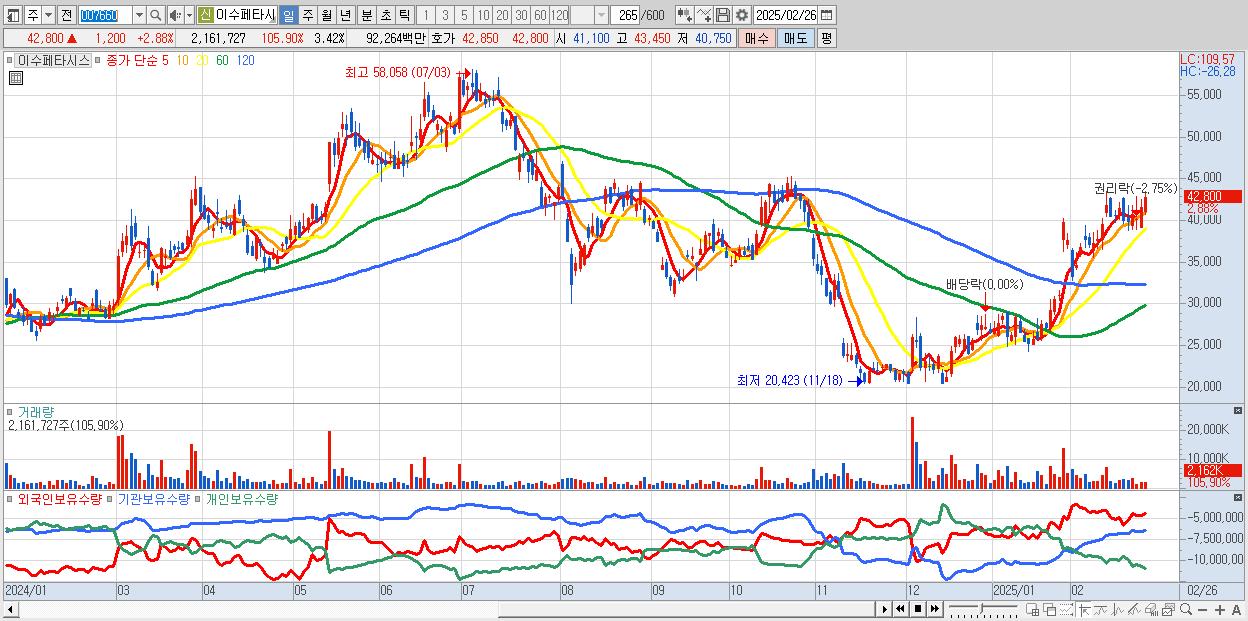 - 이수페타시스 (42,800원 ▲ 2.88% , 시총: 27,069억, 외국인 순매수 거래금:49억)