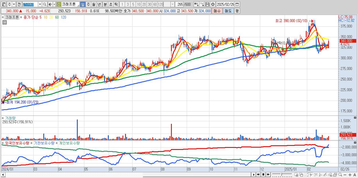 - 크래프톤 (340,000원 ▲ 4.62% , 시총: 162,888억, 외국인 순매수 거래금:72억)