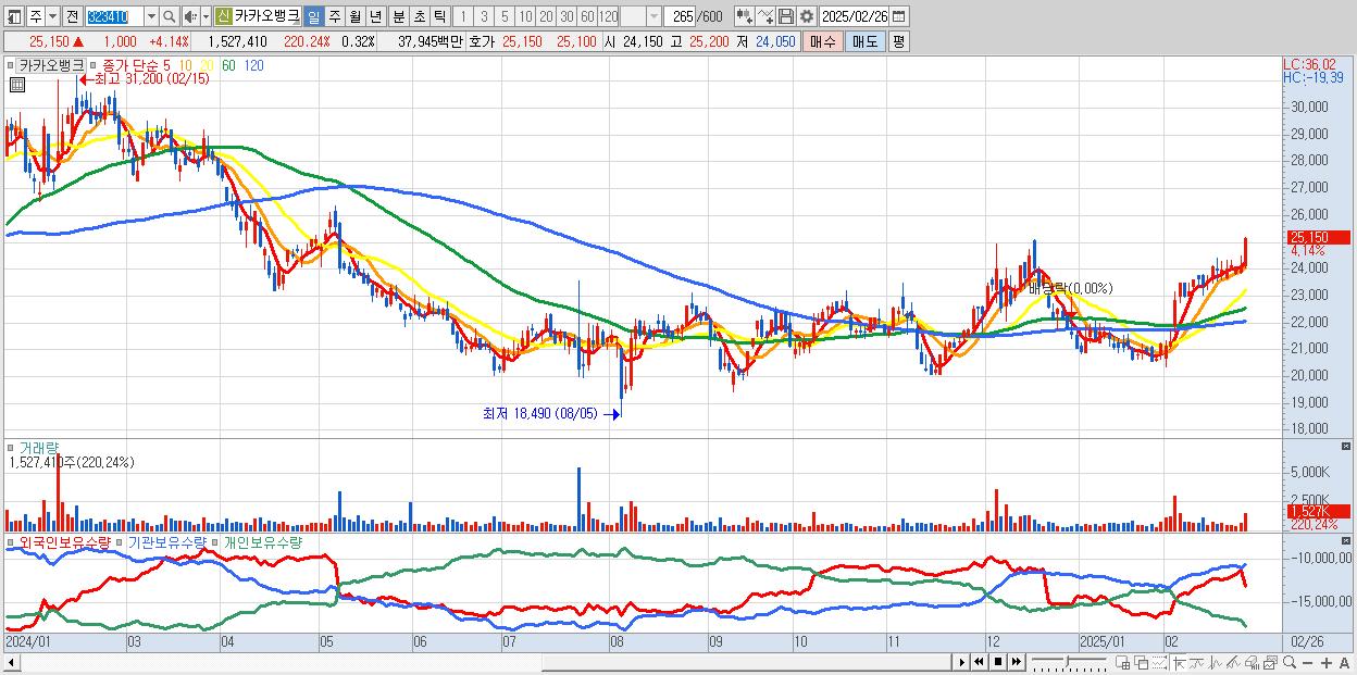 - 카카오뱅크 (25,150원 ▲ 4.14% , 시총: 119,959억, 외국인 순매수 거래금:110억)