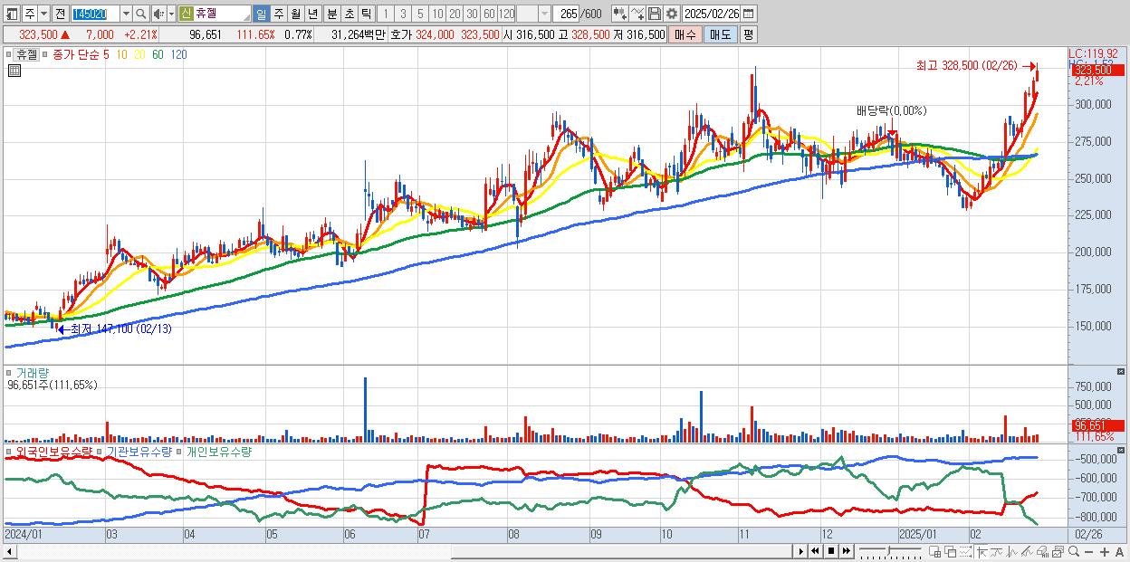 - 휴젤 (323,500원 ▲ 2.21% , 시총: 40,774억, 외국인 순매수 거래금:74억)